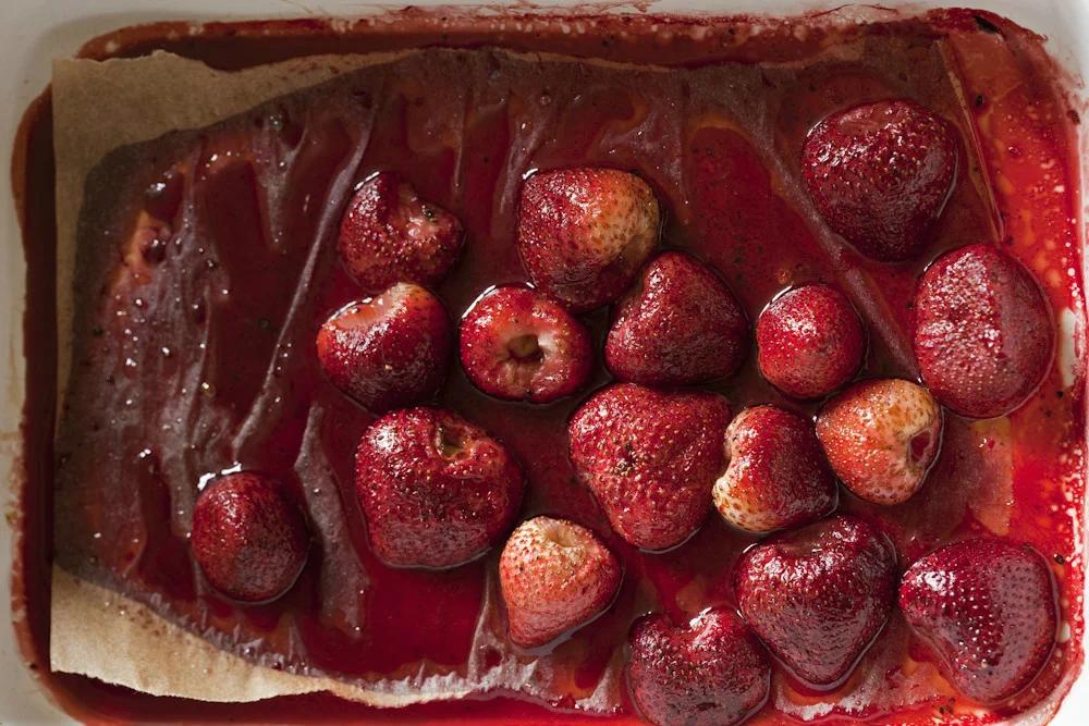 Roasting strawberries reminds me of Carly Simon’s song “Anticipation.” When you can take your time in the kitchen—or at least wait awhile for something to cook—magic happens. When you roast strawberries sloooooowly—I’m talking for 90 minutes—the alchemy that occurs is wondrous. Their flavors become so condensed and intense as they shrink. In this recipe, the strawberries are bathed in pomegranate molasses and maple syrup before roasting, for even more flavor. The last step, post-roast, is a mouth-blast of basil (a super anti-inflammatory).