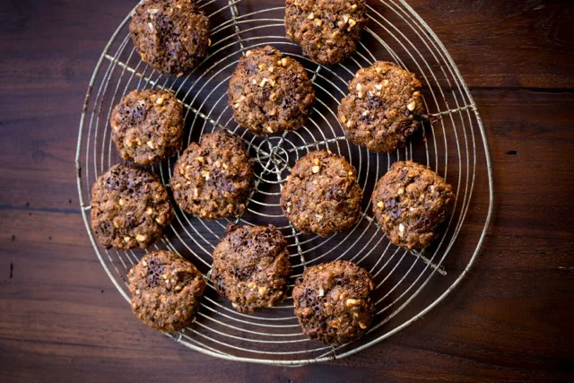 I asked my editor if I could get away with a two-word headnote for this: “Eat these!!” But she said, “No, Rebecca. You need to say more.” Sigh. How about “Eat these now!” That’s what my dog Lola did. We left them on the kitchen table, wrapped in layers of parchment and foil. Lola didn’t care. Her doggy delight senses shorted out her inhibition system (such as it is), and when we returned to the kitchen, she had jumped up on the table like a mountain goat and absconded with eight cookies. Fortunately, the chocolate content was low enough, and Lola big enough, that the vet said she’d be fine; she was, but there was no dinner for her that night. These are flourless, a blend of almond butter, egg, vanilla, cocoa nibs, and chocolate chips. The chocolate is guaranteed to elevate your mood. It sure elevated Lola’s!